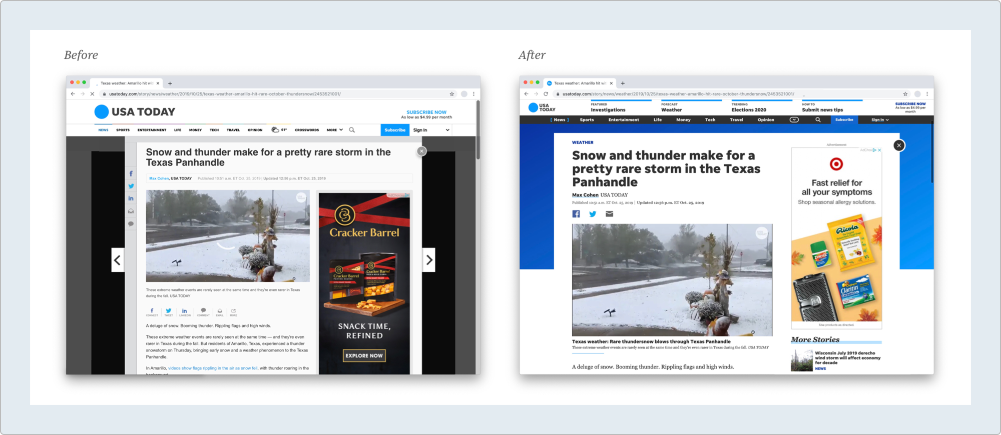 I started as an intern supporting standalone mobile apps, and ultimately had the opportunity to lead the creation of a design system and support the complete redesign of the network’s core web products. I worked at USA TODAY during a time when the industry need shifted from “have a mobile presence” to something much more complex. I was steeped in opportunities to understand and balance a variety of needs at the same time: readers’ consumption habits, journalists’ workflows, ad revenue targets, a new paywall, development speed, page load time, screen sizes as small as a watch and as large as a flatscreen. The rich landscape of design challenges, combined with the gift of a large team of passionate and kind designers, made this a wonderful place for me to “grow up” as a UX designer.